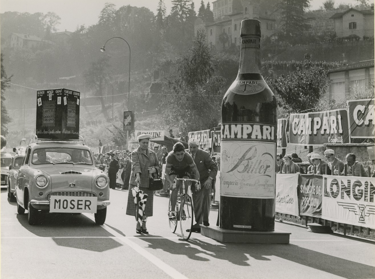 Tra gli anni ’30 e ’60 il marchio Campari segue i ciclisti che stanno costruendo la leggenda del ciclismo italiano e internazionale: Coppi, Girardengo, Cinelli, Moser, Anquetil, Baldini, Gaul, Magni.