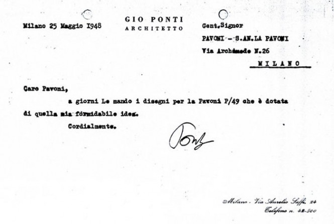 Splendido il documento reperito in rete con la lettera del designer milanese al titolare dell’azienda Pavoni: