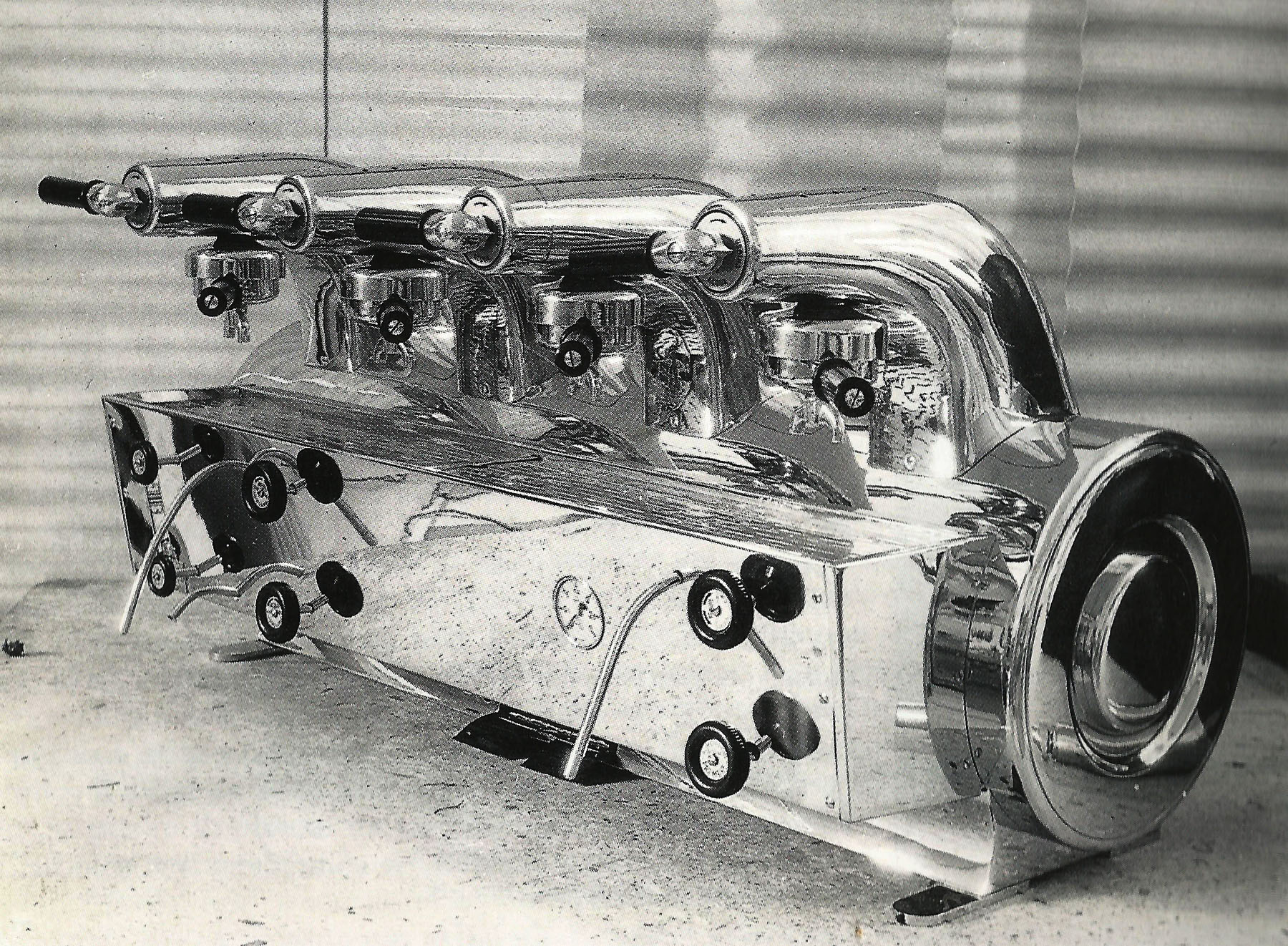 È una scultura di metallo dal profilo sinuoso e complesso, un congegno meccanico in cui «l’ermeticità dell’organismo», come auspicava lo stesso architetto, nascondeva «la fatica del proprio lavoro»: “La Cornuta” – così si chiama questo modello ideato da Ponti – cela nei suoi tre volumi (becchi, corpo centrale, carter) tutto il complesso di meccanismi e dispositivi di norma esibiti dagli altri apparecchi omologhi.