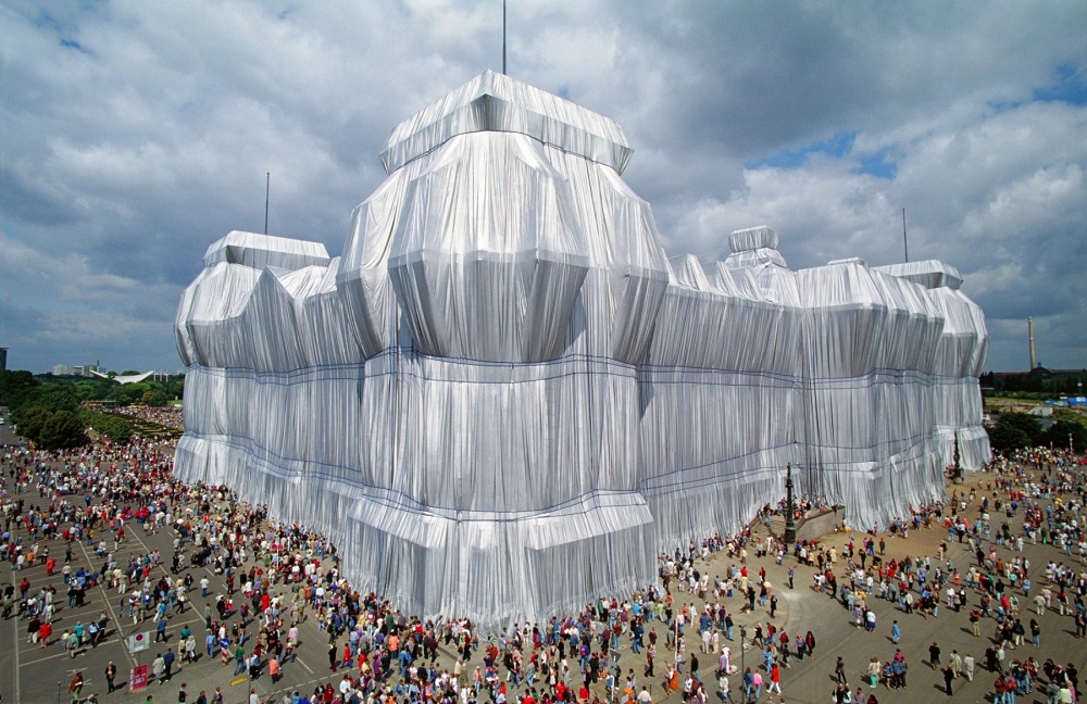 Famosissima l’opera imballaggio del Reichstag (giugno 1995) – il Reichstag di Berlino venne impacchettato con un tessuto argentato. Milioni di persone andarono a vedere l’opera.