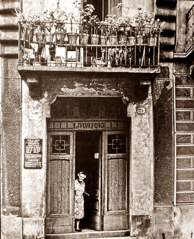 Abbiamo recuperato una foto piuttosto datata, in cui è possibile osservare una signora fuori da un portone, con una chiara indicazione in alto: LAVATOIO.