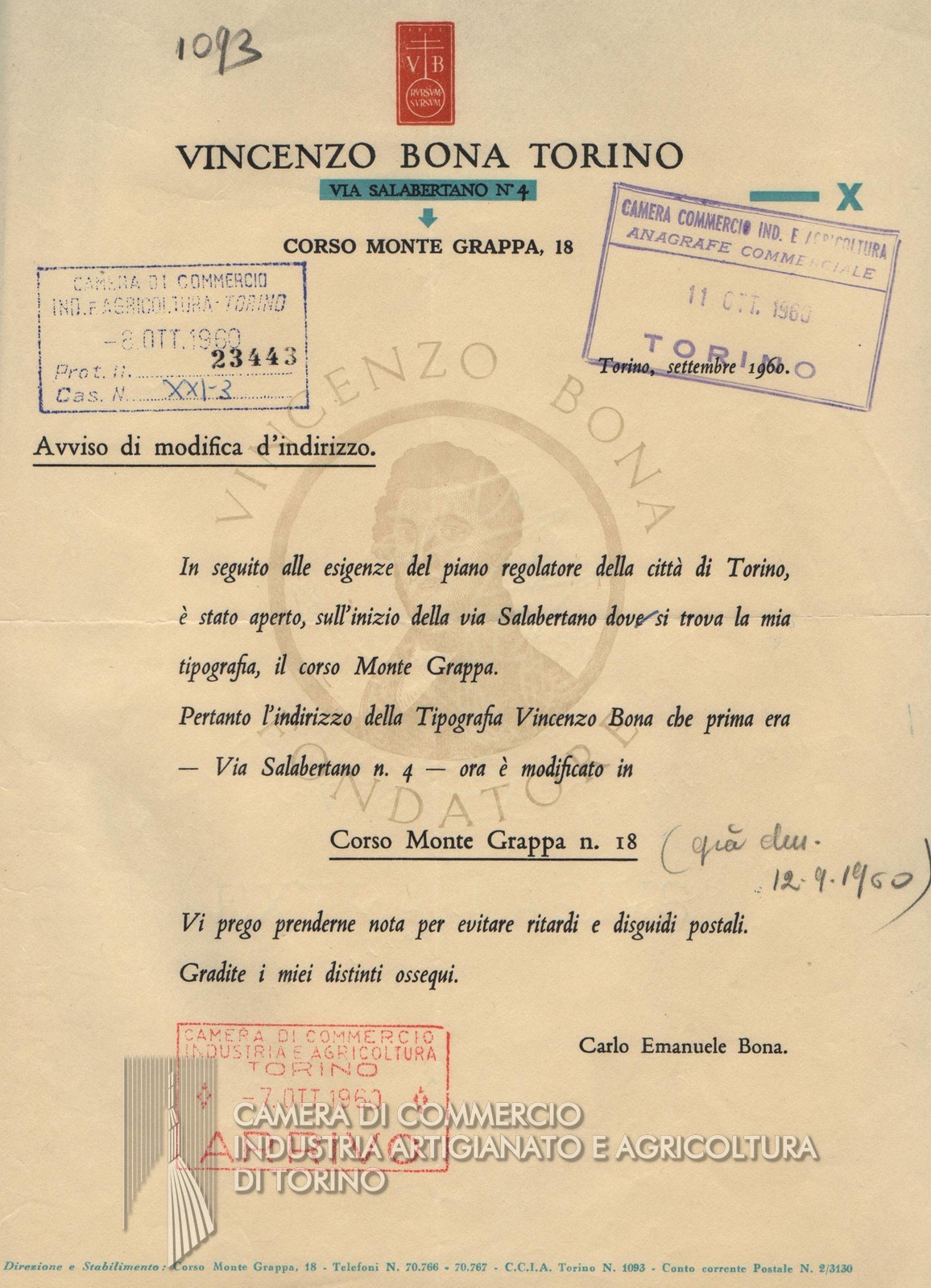 Le storia della Tipografia Vincenzo Bona, una delle più antiche tipografie d’Italia, prende avvio nel 1777, quando a Torino apriva i battenti la Tipografia Patria. Dopo alcuni passaggi societari negli anni Trenta dell’Ottocento Vincenzo Bona divenne titolare dell’impresa in società prima con Mussano e poi con tale Zecchi. Nel 1855, con la morte di quest’ultimo, l’azienda rimase al solo Bona. Sempre in quell’anno, con l’intenzione di dare un nuovo slancio all’attività, procedette all’acquisto di una delle prime macchine tipografiche (ideate da Federico Koenig) che andò a sostituire parecchi torchi a mano. La cultura e il gusto di Vincenzo Bona fecero il resto, tanto che la tipografia torinese divenne in breve molto conosciuta e nel 1858 il re Vittorio Emanuele II gli conferì il riconoscimento di “Tipografo dell’accademia Albertina di belle arti”.