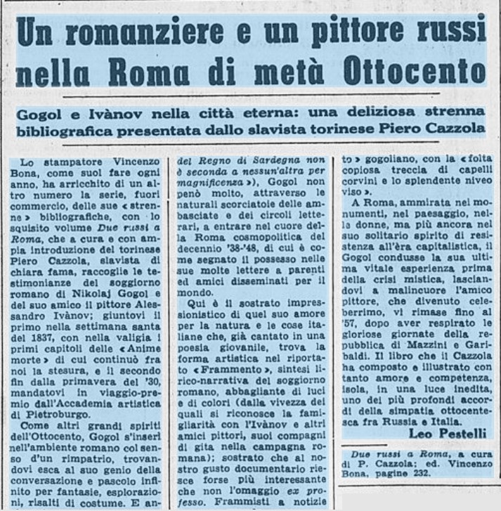 Qui sotto, nell’immagine, articolo de La Stampa del 1966 che racconta la pubblicazione “nella specialissima edizione” del testo Due Russi a Roma, in cui lo slavista Cazzola raccoglieva le testimonianze del soggiorno a Roma di Gogol e Ivanov.