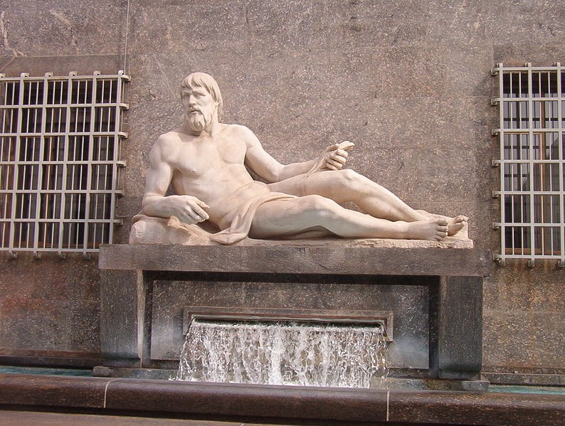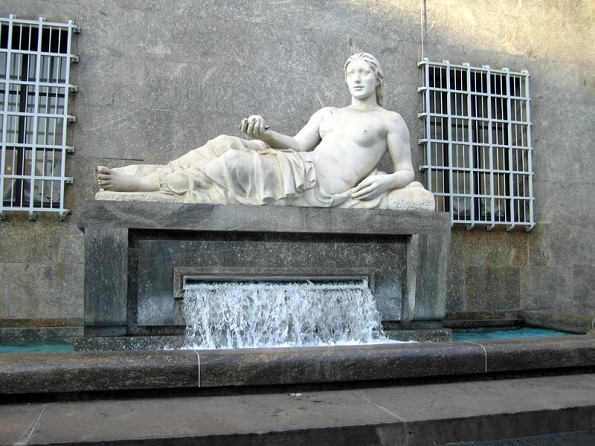 Fu dunque bandito un concorso, aperto a tutti i giovani artisti dell’epoca, che condusse all’esame di 56 bozzetti. Alla fine vinse lo scultore Umberto Baglioni [Scalea 1893 – Torino 1965], che scelse di rappresentare i due corsi d’acqua sotto forma di figure umane: un uomo barbuto e una donna vistosamente formosa, entrambi adagiati su un basamento marmoreo.