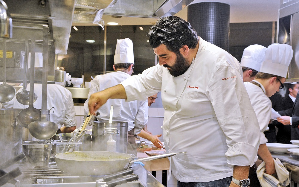 Se lo avete visto in televisione saprete quanta cura mette nella preparazione, quanto la qualità della materia prima, il suo rispetto, la pulizia ed il rigore nel suo processo di preparazione vanno a contribuire alla costruzione di un piatto unico, di un’esperienza multi-sensoriale. Infatti la sua cucina spinge: “Amo ricercare e scoprire le giuste combinazioni per esaltare al meglio le proprietà di ogni singolo prodotto anche grazie alla collaborazione con la mia brigata esattamente come un padre nella sua famiglia. Anche qui si crea il giusto equilibrio tra diversi ‘ingredienti’: guida, comando, controllo e affetto.”